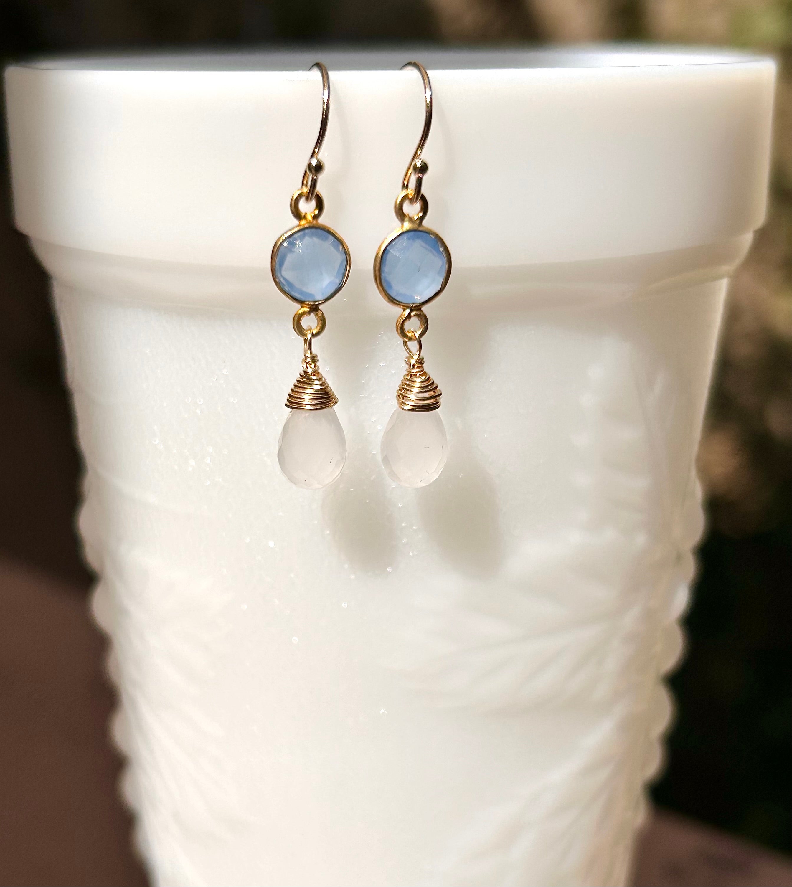 #790 milky crystal drop/blue chalcedony earrings