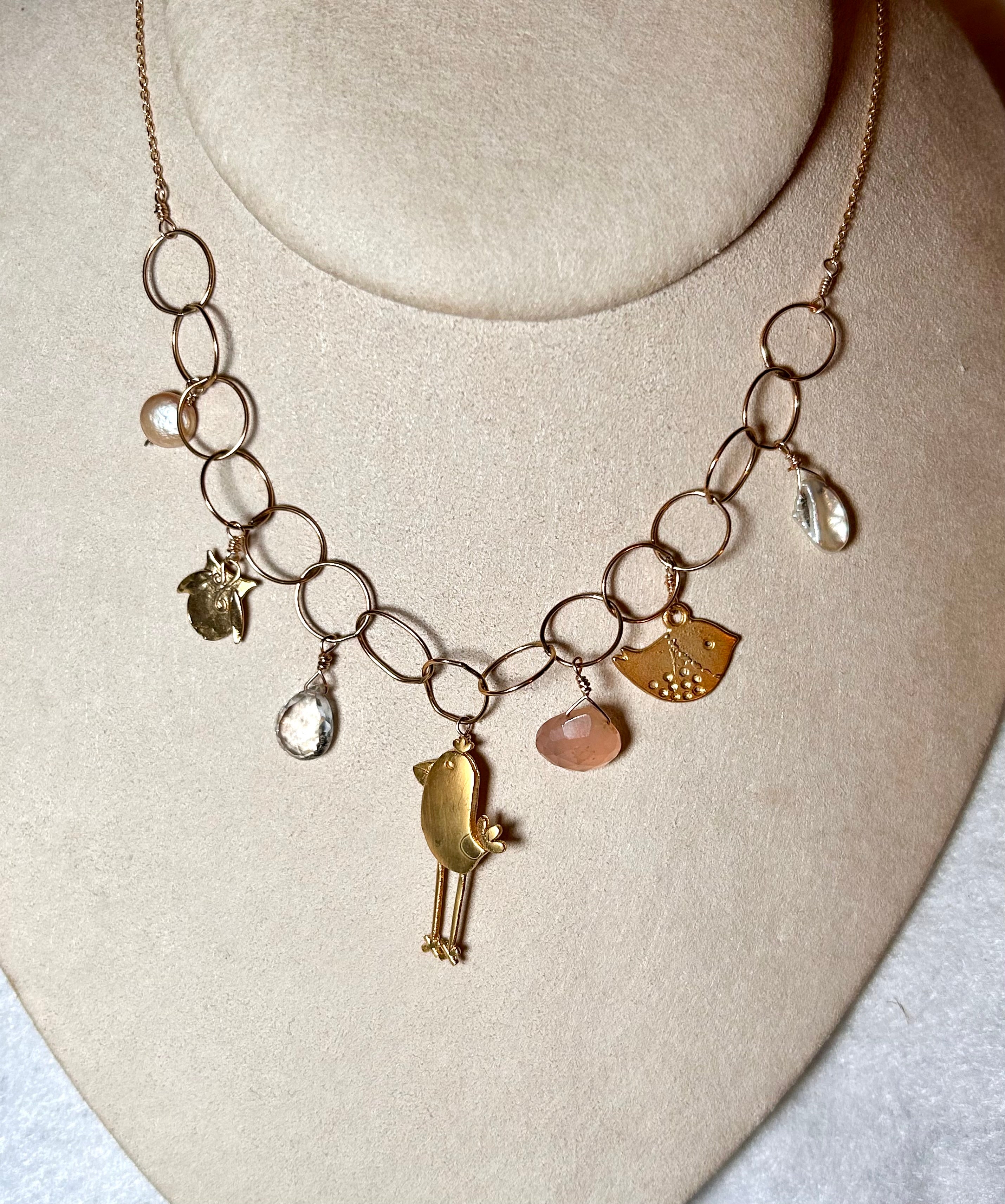 gold, filled Tall, chick, sparrow, owl gemstones Pearls charm necklace 16 1/2 inch