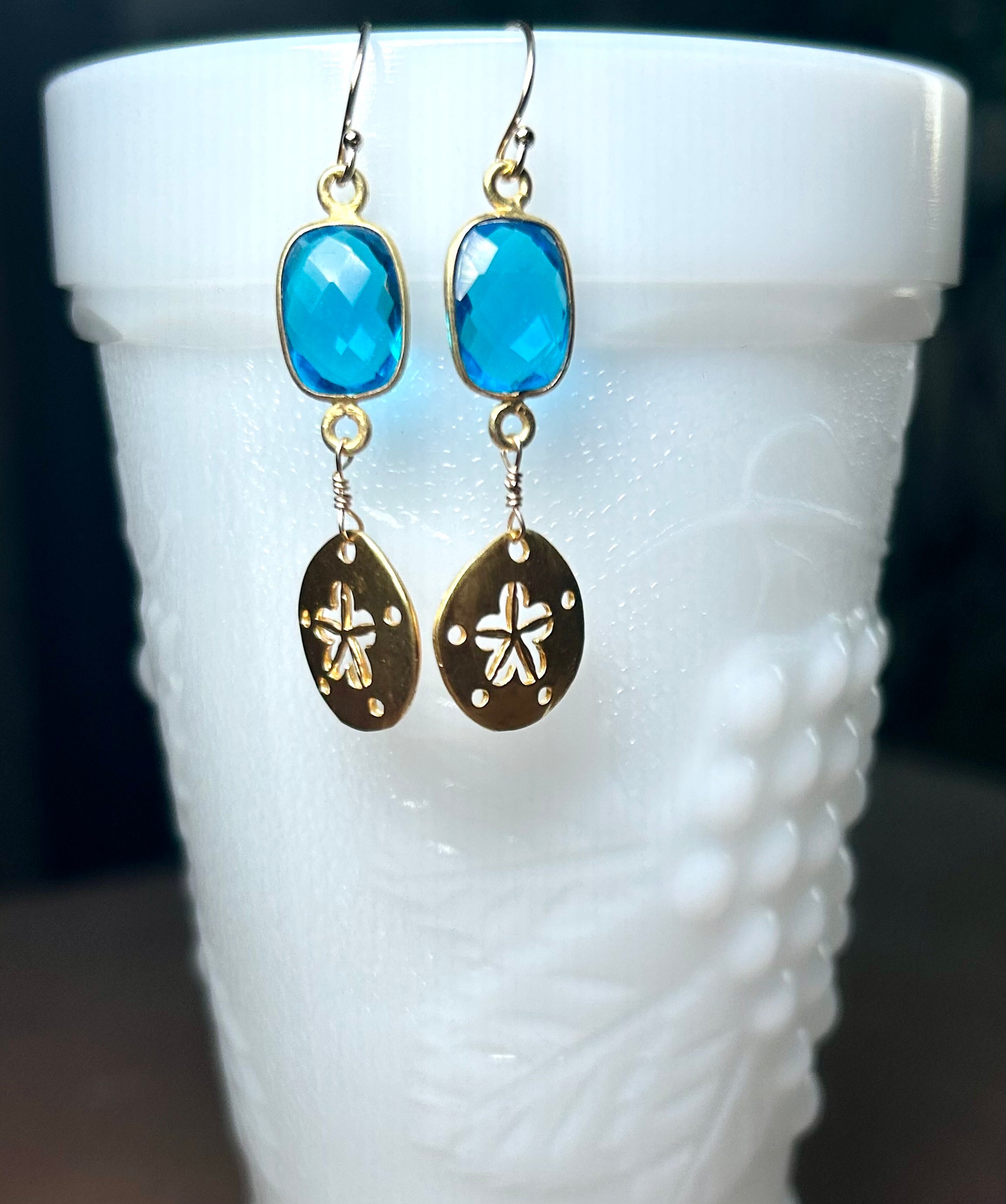 blue quartz sand dollar gold filled earrings 1 7/8”