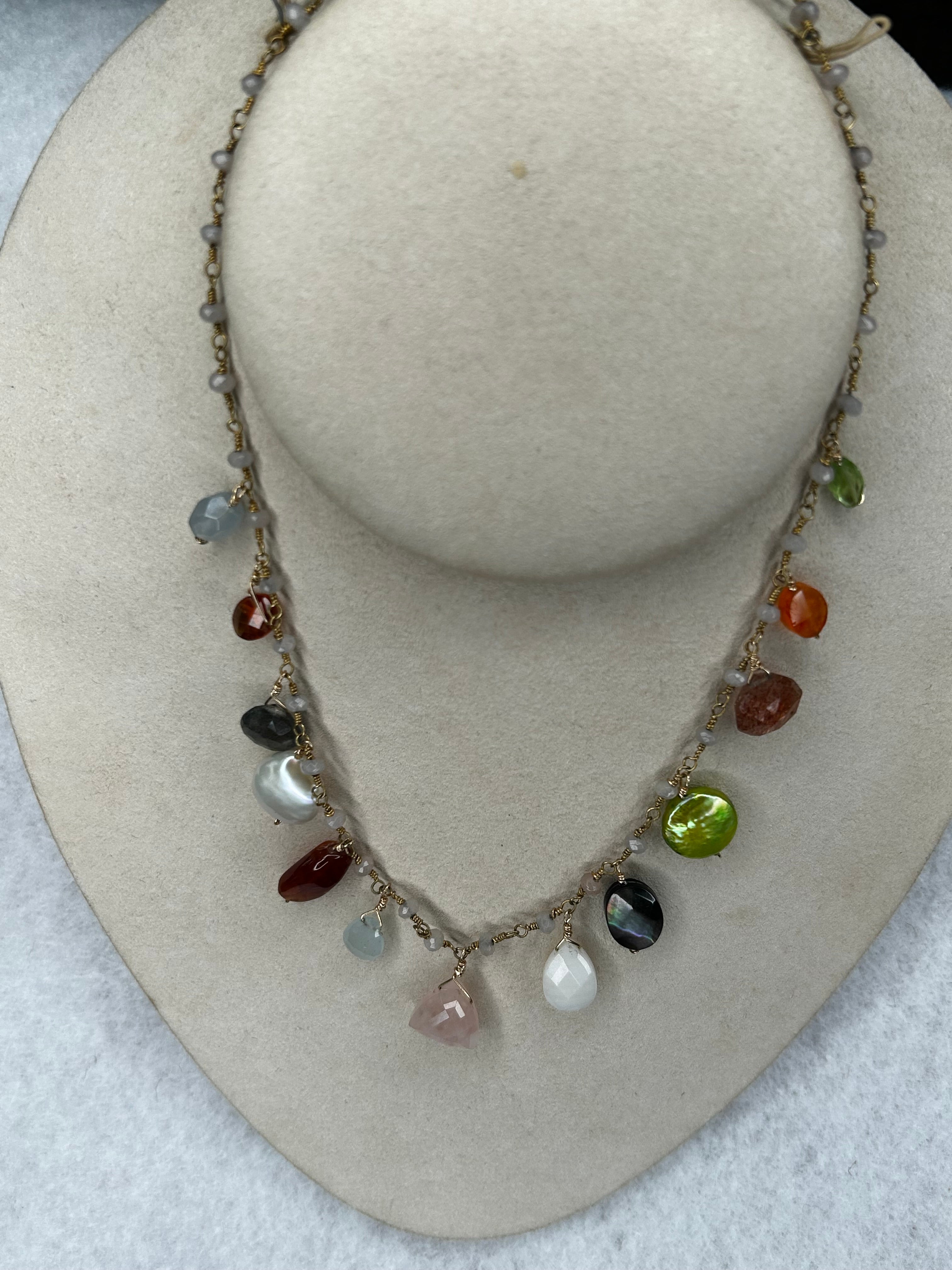 multi gemstones and multi pearls dangle from 14 K gold filled chain 17 inches